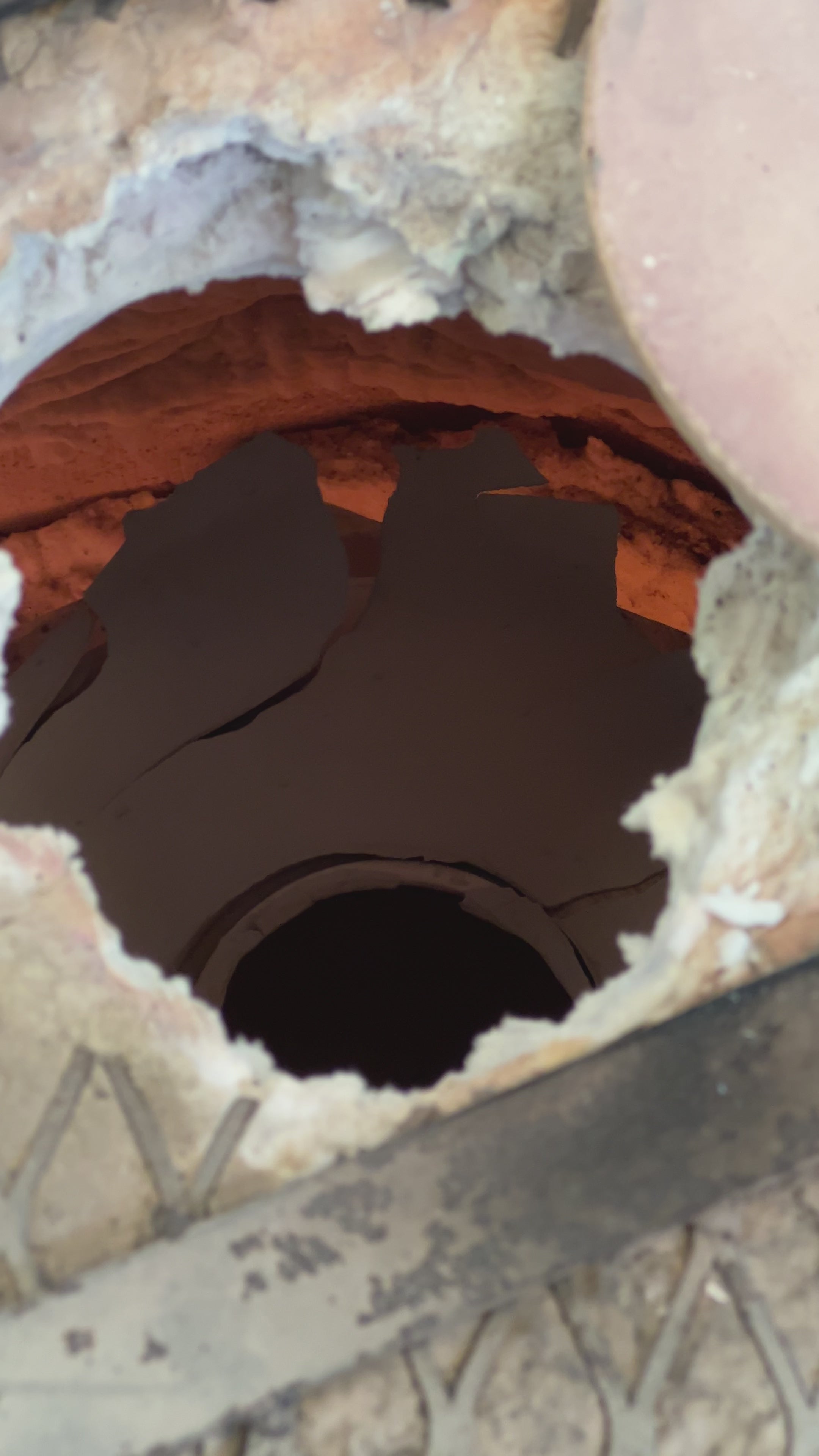 This 12 by 9.5in. vase is wheel-thrown with a smooth off-white stoneware clay and the surface is decorated with the naked raku technique.