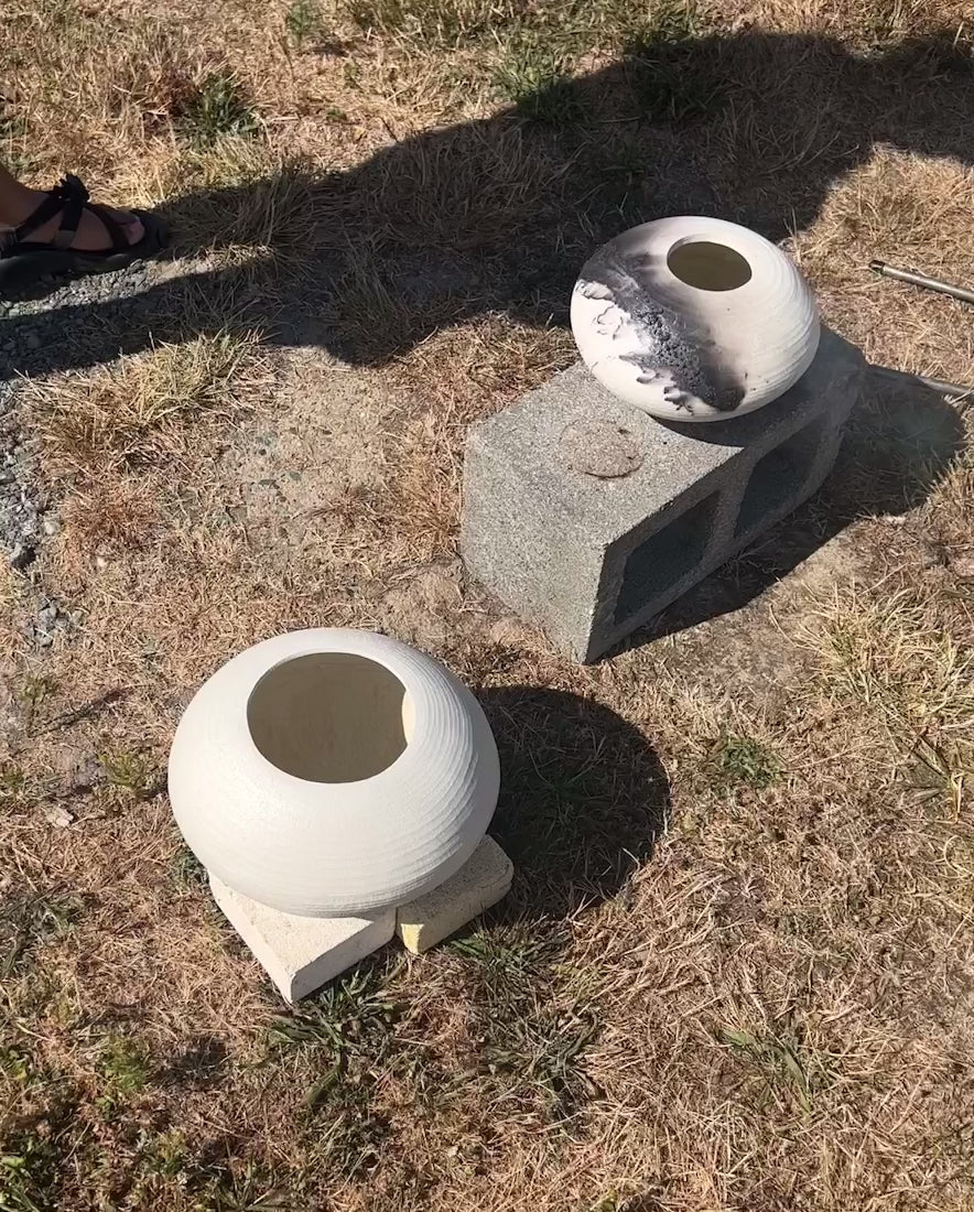 This 12 by 7in. vase is wheel-thrown with a smooth off-white stoneware clay and the surface is decorated with burned horsehair.